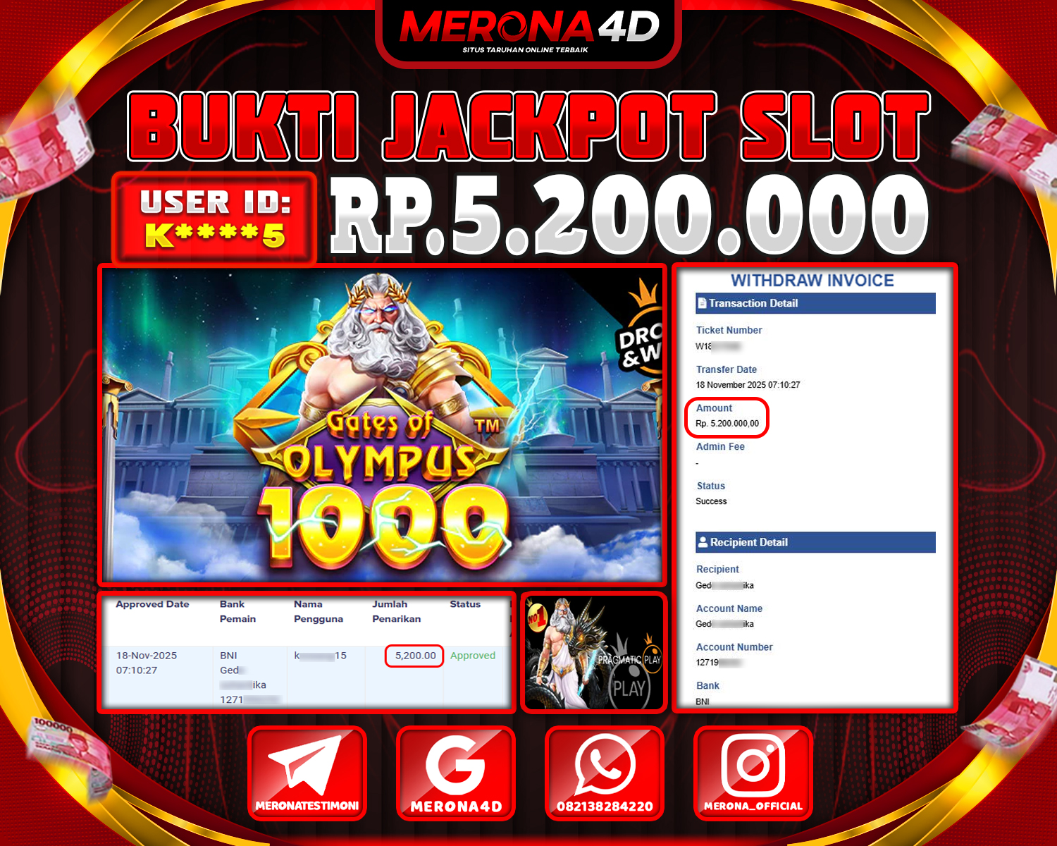 Selamat Kepada Member MERONA4D G*****5 Telah Jackpot Di GATES OF OLYMPUS 1000