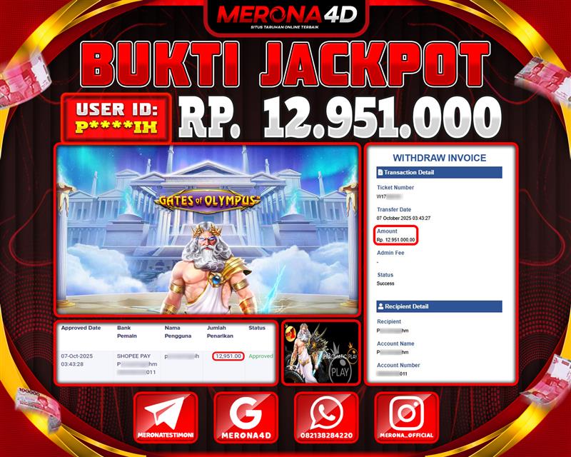 Selamat Kepada Member MERONA4D S****9 Telah Jackpot Di GATES OF OLYMPUS 1000