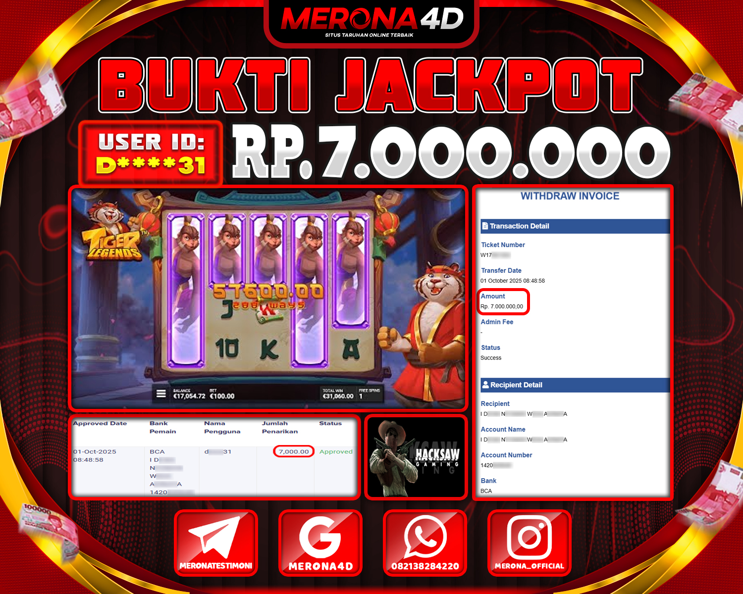 Selamat Kepada Member MERONA4D D****1 Telah Jackpot Di TIGER LEGENDS