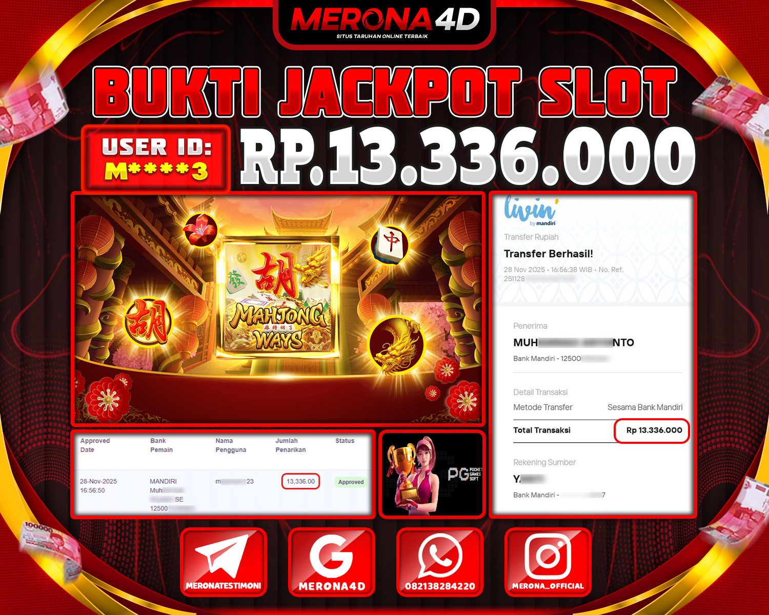 Selamat Kepada Member MERONA4D M****3 Telah Jackpot Di MAHJONG WAYS