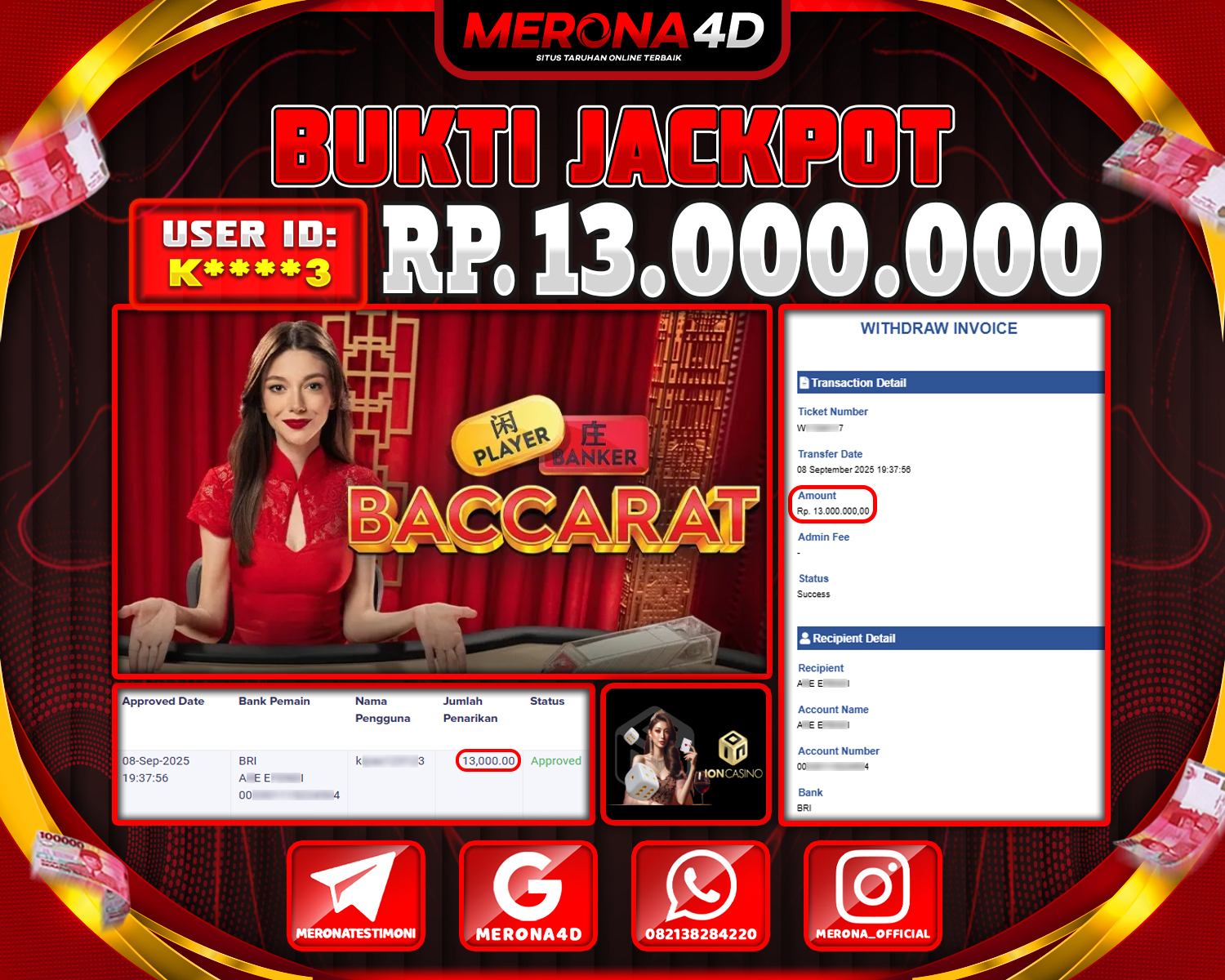 Selamat Kepada Member MERONA4D K****3 Telah Jackpot Di BACCARAT