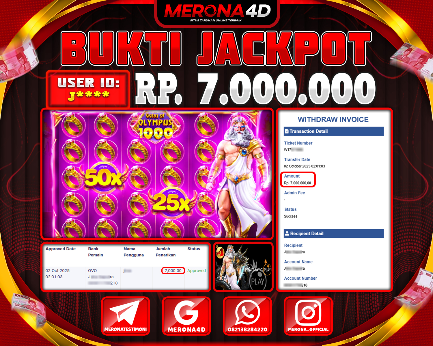 Selamat Kepada Member MERONA4D J***** Telah Jackpot Di GATES OF OLYMPUS 1000
