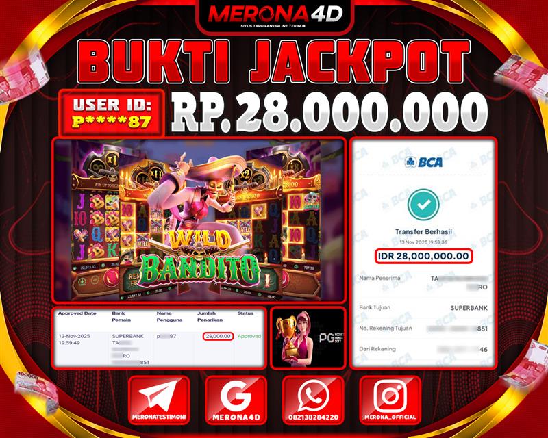 Selamat Kepada Member MERONA4D P*****87 Telah Jackpot Di WILD BANDITO