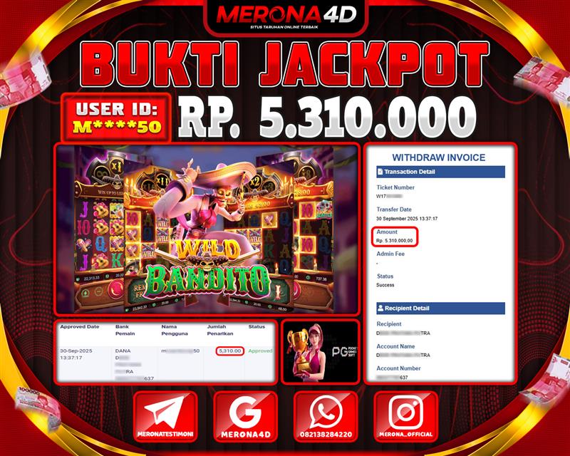 Selamat Kepada Member MERONA4D M*****50 Telah Jackpot Di WILD BANDITO