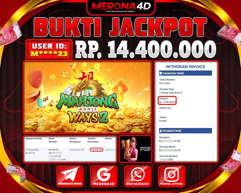 Selamat Kepada Member MERONA4D M*****23 Telah Jackpot Di MAHJONG WAYS 2