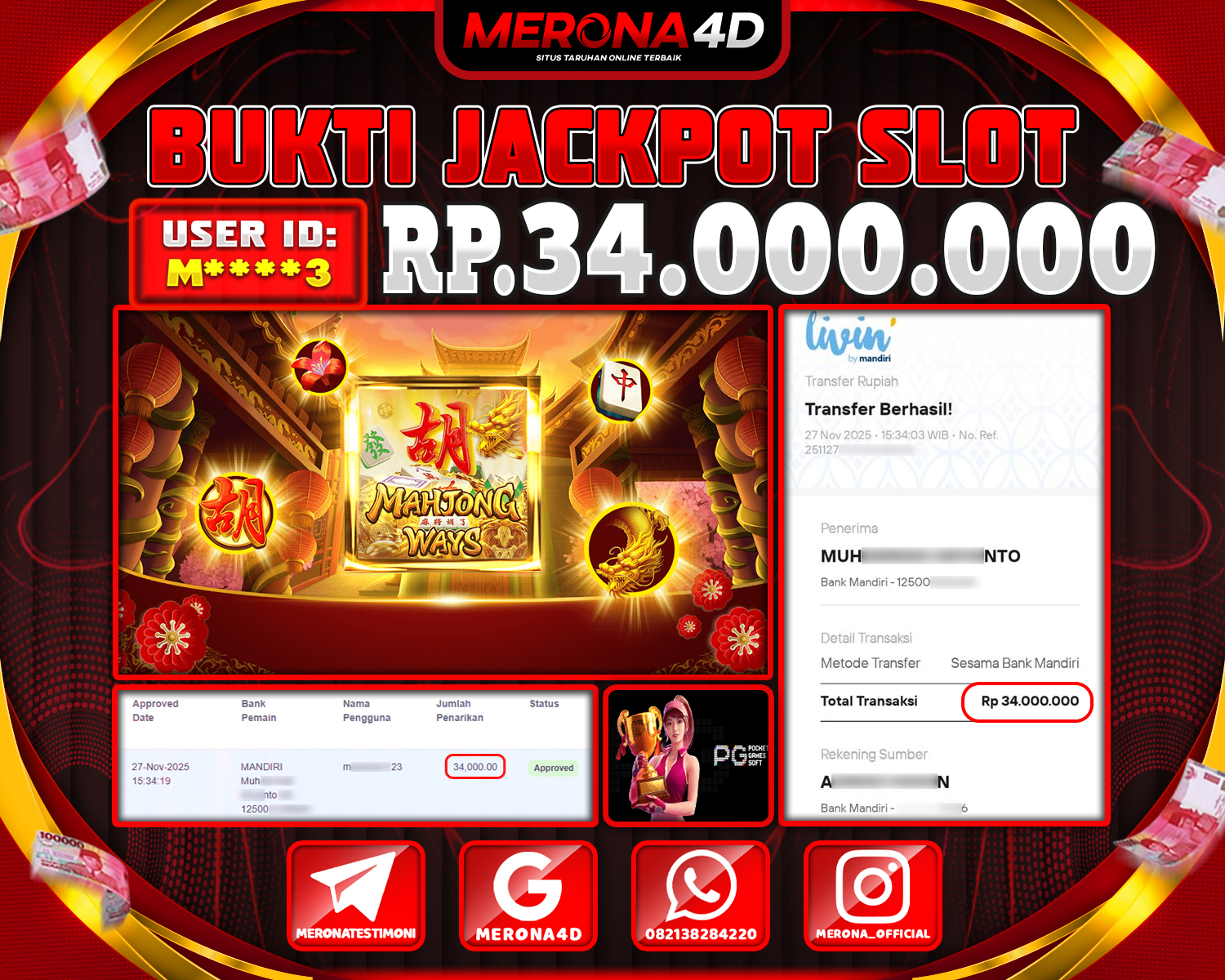 Selamat Kepada Member MERONA4D M****3 Telah Jackpot Di MAHJONG WAYS