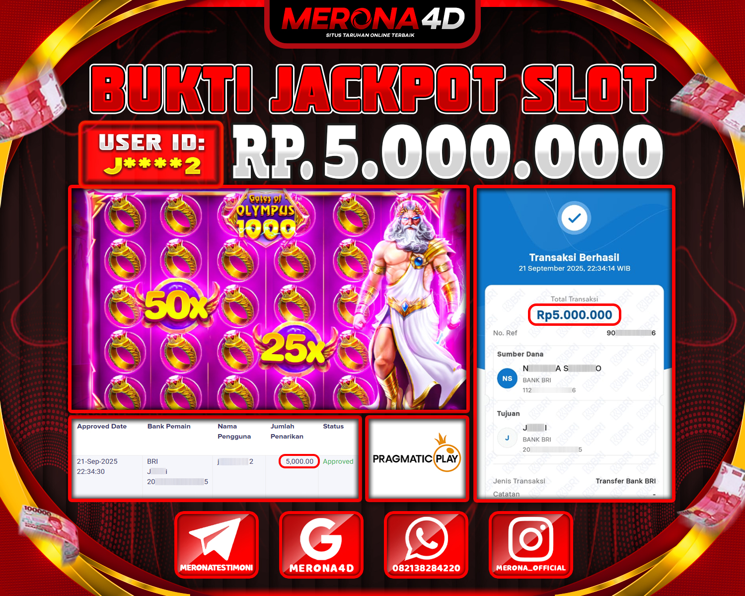 Selamat Kepada Member MERONA4D J****2 Telah Jackpot Di GATES OF OLYMPUS 1000