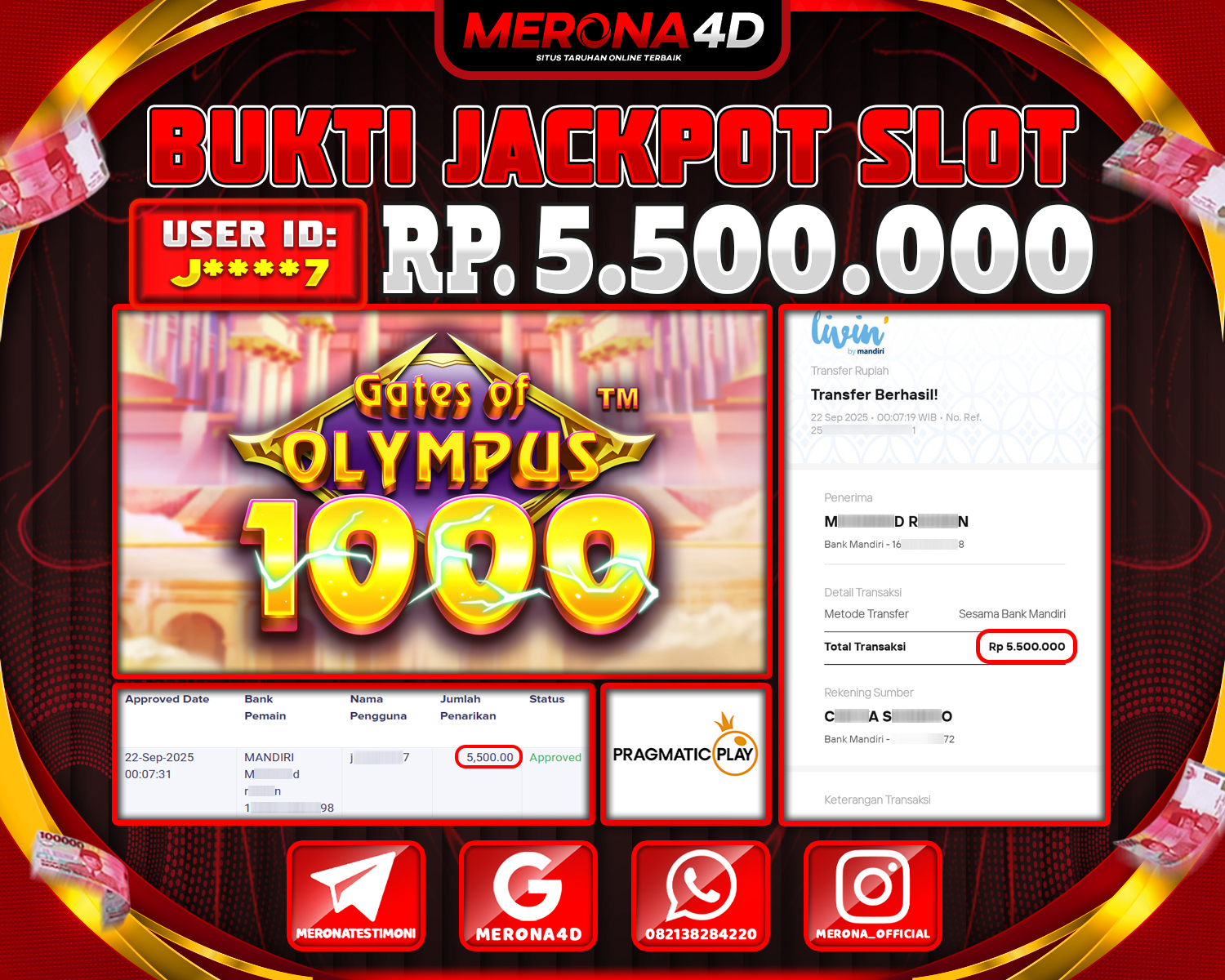 Selamat Kepada Member MERONA4D K****1 Telah Jackpot Di GATES OF OLYMPUS 1000
