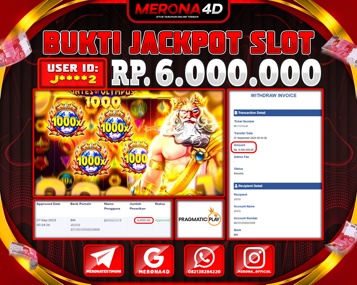 Selamat Kepada Member MERONA4D J****2 Telah Jackpot Di GATES OF OLYMPUS 1000