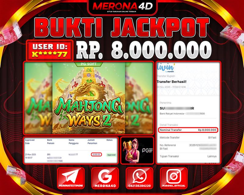 Selamat Kepada Member MERONA4D K*****77 Telah Jackpot Di MAHJONG WAYS 2