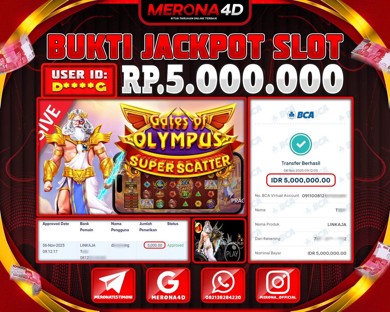 Selamat Kepada Member MERONA4D E****8 Telah Jackpot Di GATES OF OLYMPUS SUPER SCATTER