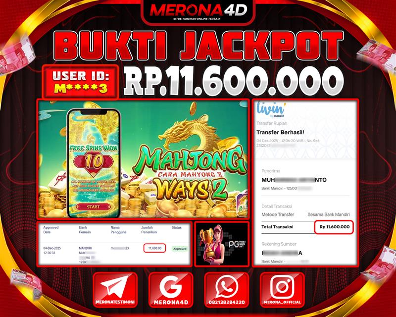 Selamat Kepada Member MERONA4D M*****3 Telah Jackpot Di MAHJONG WAYS 2