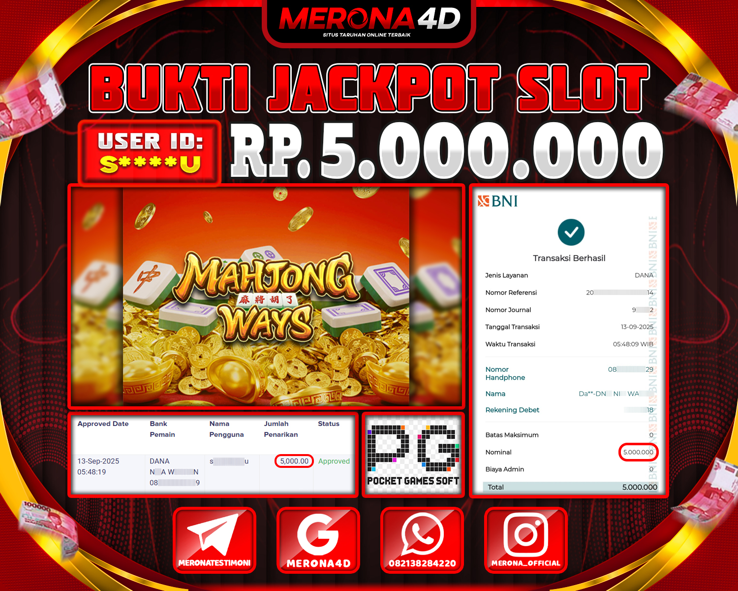 Selamat Kepada Member MERONA4D D*****13 Telah Jackpot Di MAHJONG WAYS