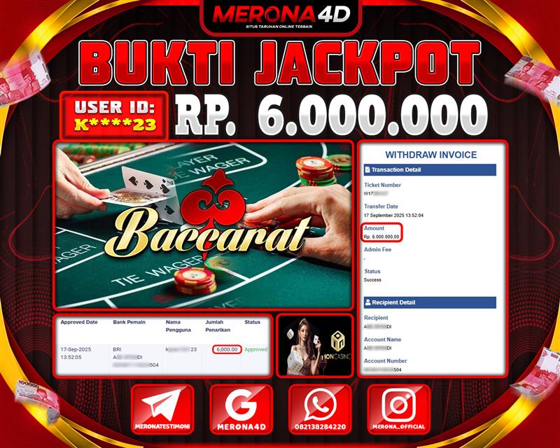 Selamat Kepada Member MERONA4D K*****3 Telah Jackpot Di BACCARAT