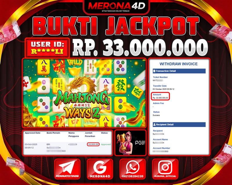 Selamat Kepada Member MERONA4D R*****LI Telah Jackpot Di MAHJONG WAYS 2