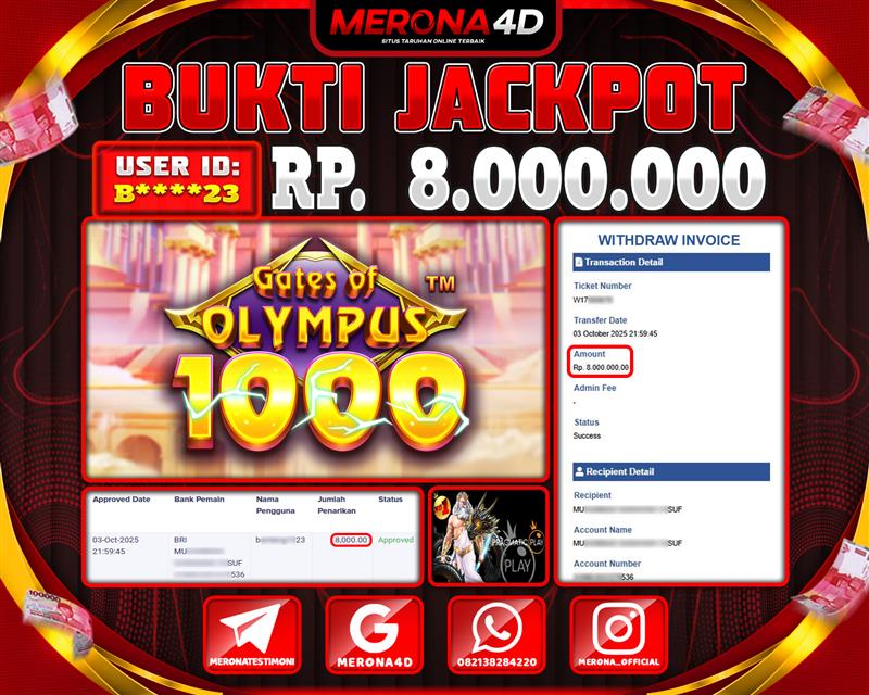 Selamat Kepada Member MERONA4D B*****23 Telah Jackpot Di GATES OF OLYMPUS 1000