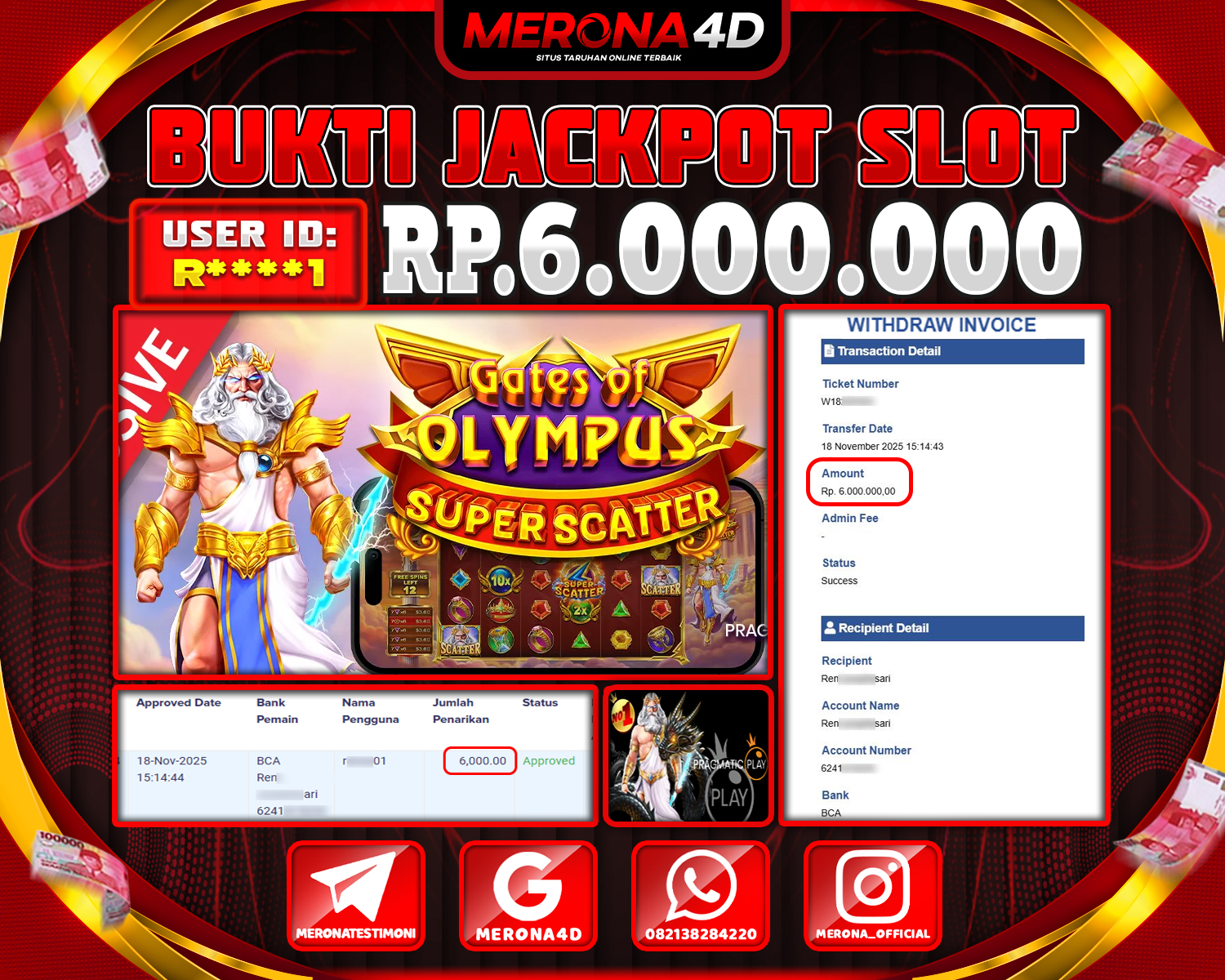 Selamat Kepada Member MERONA4D R*****1 Telah Jackpot Di GATES OF OLYMPUS SUPER SCATTER