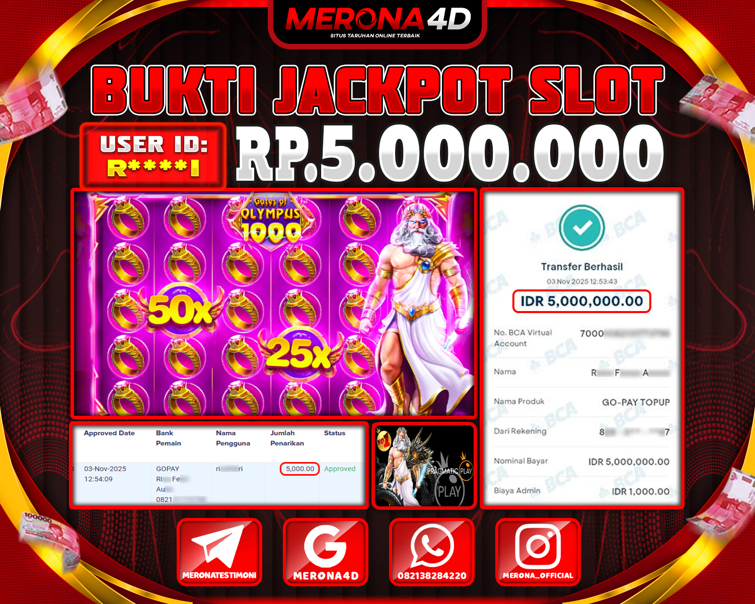 Selamat Kepada Member MERONA4D G*****11 Telah Jackpot Di GATES OF OLYMPUS SUPER SCATTER