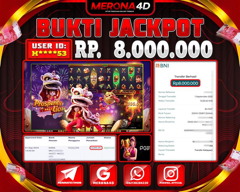 Selamat Kepada Member MERONA4D H*****53 Telah Jackpot Di PROSPERITY LION