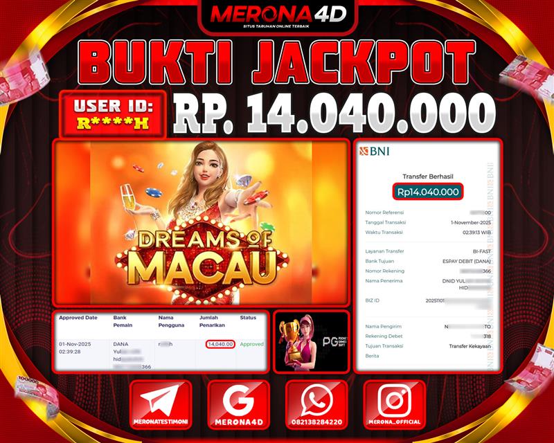 Selamat Kepada Member MERONA4D R*****H Telah Jackpot Di DREAMS OF MACAU