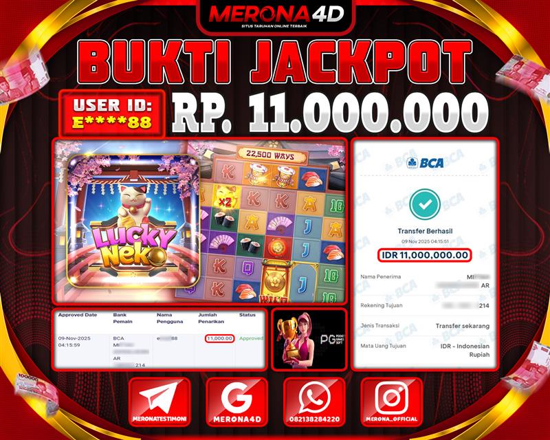 Selamat Kepada Member MERONA4D E*****88 Telah Jackpot Di LUCKY NEKO