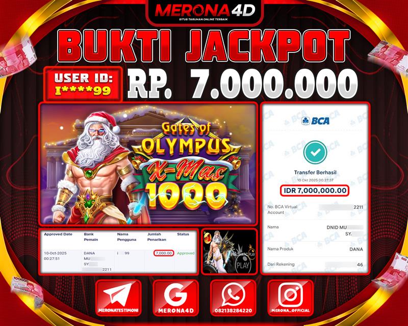 Selamat Kepada Member MERONA4D I*****99 Telah Jackpot Di GATES OF OLYMPUS XMAS 1000