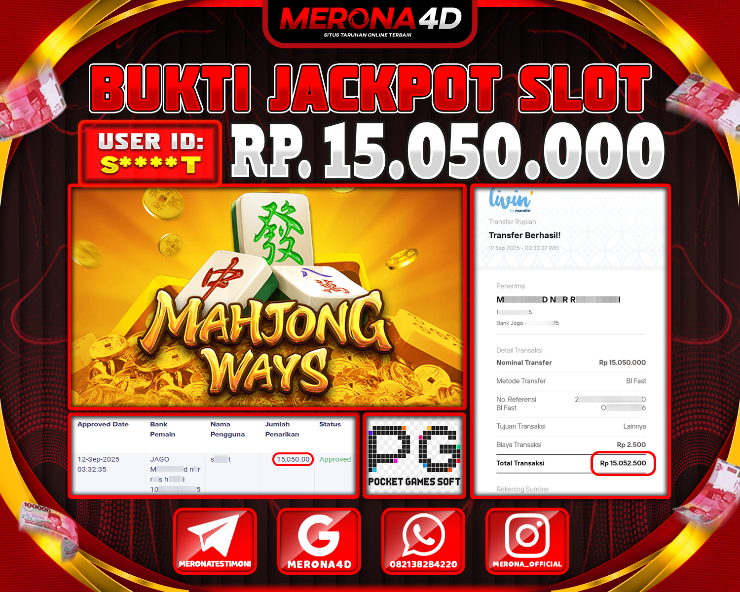 Selamat Kepada Member MERONA4D B****7 Telah Jackpot Di MAHJONG WAYS 2