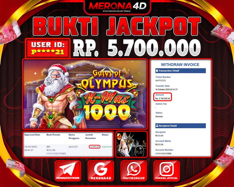 Selamat Kepada Member MERONA4D P*****21 Telah Jackpot Di GATES OF OLYMPUS XMAS 1000