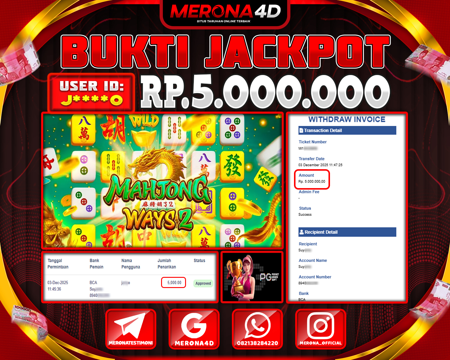 Selamat Kepada Member MERONA4D J****O Telah Jackpot Di MAHJONG WAYS 2