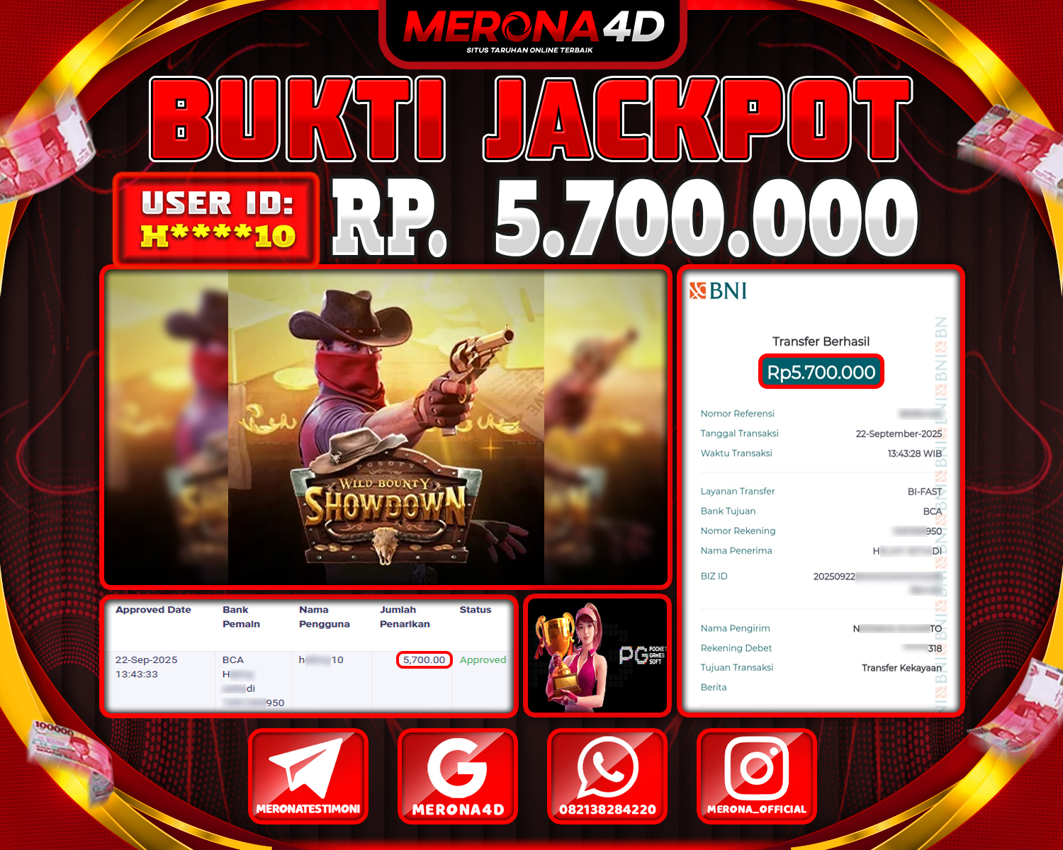 Selamat Kepada Member MERONA4D M*****0 Telah Jackpot Di WILD BOUNTY SHOWDOW