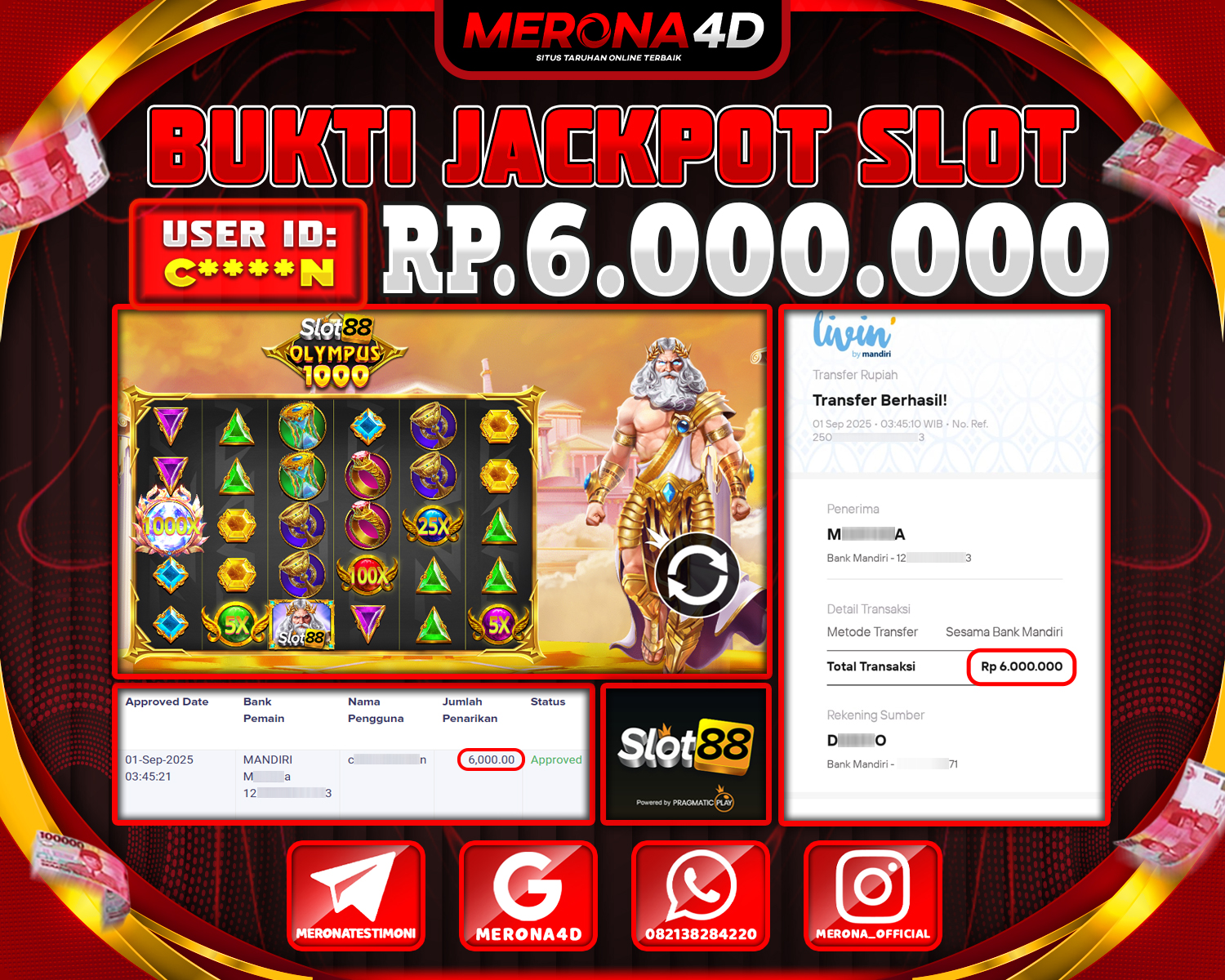 Selamat Kepada Member MERONA4D C*****N Telah Jackpot Di SLOT88 OLYMPUS 1000