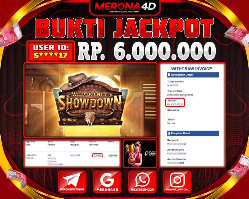 Selamat Kepada Member MERONA4D S*****17 Telah Jackpot Di WILD BOUNTY SHOWDOWN
